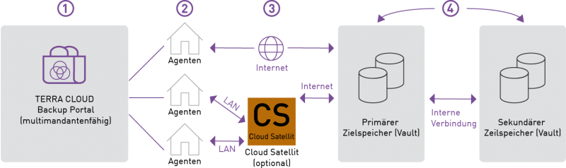 3.Die Sicherung erfolgt entweder direkt in die Cloud oder optional über einen separaten, lokalen Speicher (Satellit) in die Cloud